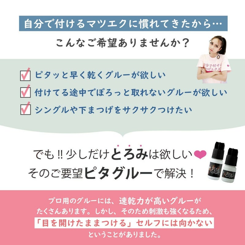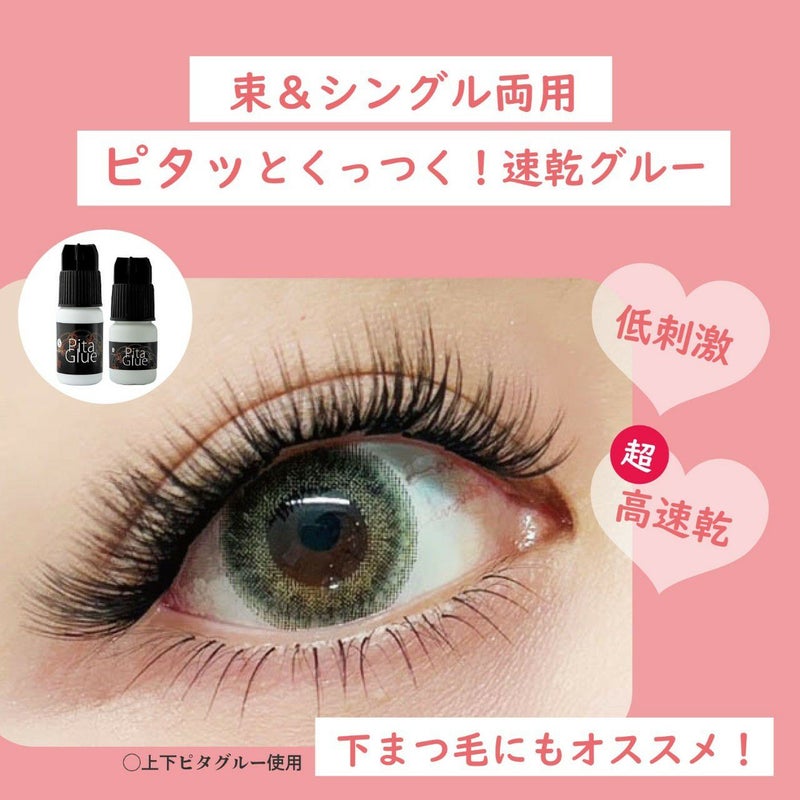 今までセルフトップグルー&ラッシュベースを使用していましたが、ピタグルーの乾きがどうなのか気になり試しに購入。確かにセルフトップグルー単体と比べると早いですが、何となく乾いた後が硬めに感じました。個人的にはセルフトップグルー&ラッシュベースの方が馴染みも付けやすさも良い気がしました。