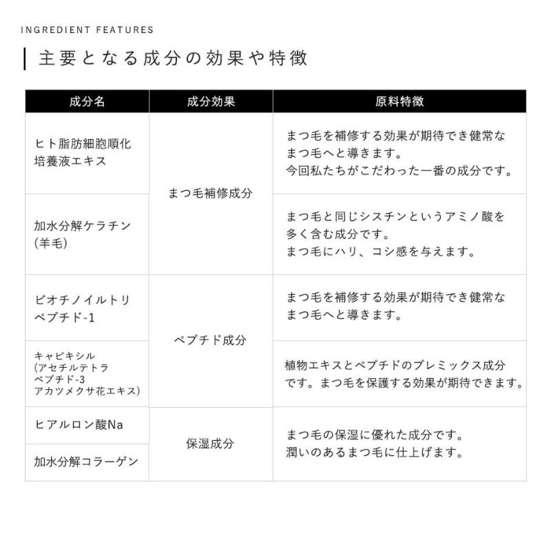 まつ毛補修成分、ペプチド、ヒト幹細胞培養液、抗菌、アレルギー防止成分配合で
