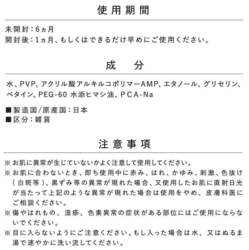 水、PVP、アクリル酸アルキルコポリマーAMP、エタノール、グリセリン、